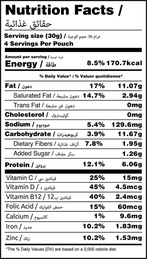 Cashews, Milk Solids, Iodized Salt, Sugar, Non Diary Creamer, Cashew Powder, Mixed Spices & Herbs (Basil, Parsley, Oregano, Black Pepper, Hydrolysed Vegetable Protein (Soya), Anticaking Agents (E551).Dextrin, Vitamins