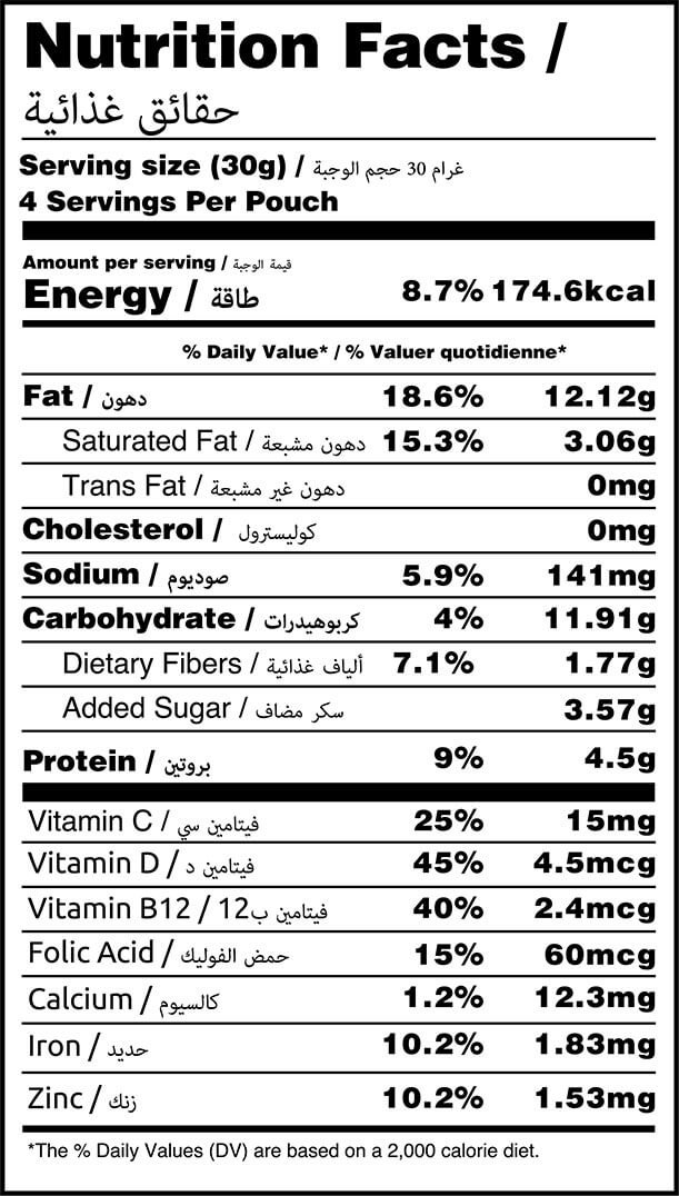 Cashews, Mixed Spices & Condiments (Chilli,Garlic,Onion ,Cumin,Oregano), Milk Solids,Hydrolysed Vegetable Protein( Soya) , Sugar, Iodized Salt,Acidity Regulators (E330) , Thickener (E415),Anticaking Agents (E551), Dextrin , Vitamins